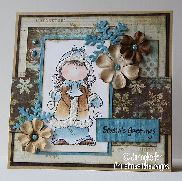 Marion met Judi en Rob from Judi Kins personally on the Art Specially event. They had a good talk and Marion invited them as sponsors to our blog. They were happy to be our sponsor. At the end of the Event Marion got a bag with some of Judi's stamps and told Marion that she could use the stamps for the challenge blog and give them away to the winner, but not all at the same challenge ;o) The stamps are pretty unique because Judi used them herself on the Art Event. So they came with a little paint on them and her fingerprints. Hope you all don't mind and enjoy the kind gesture they gave us! For this challenge you can win one of the stamps from that bag and that is this beautiful Christmastree ...